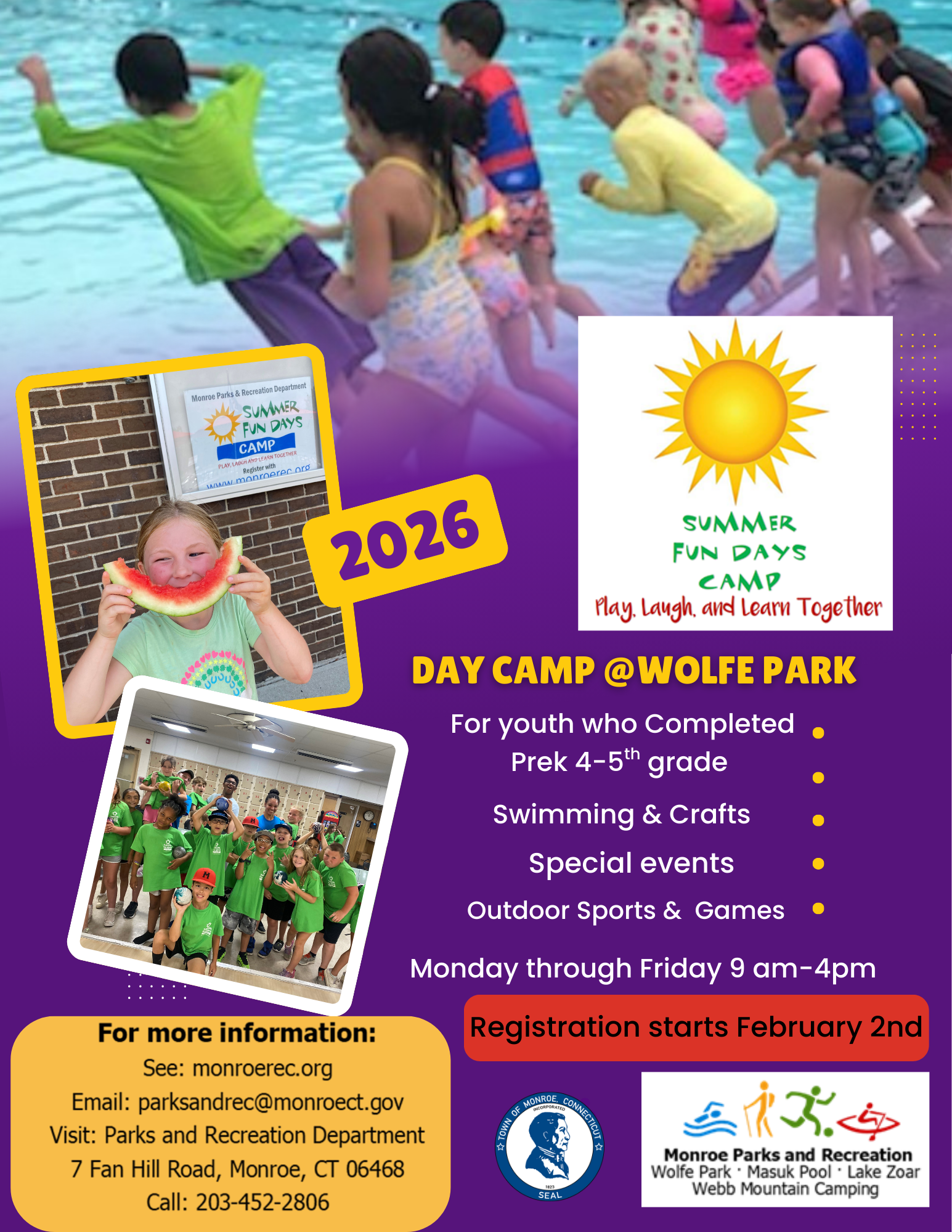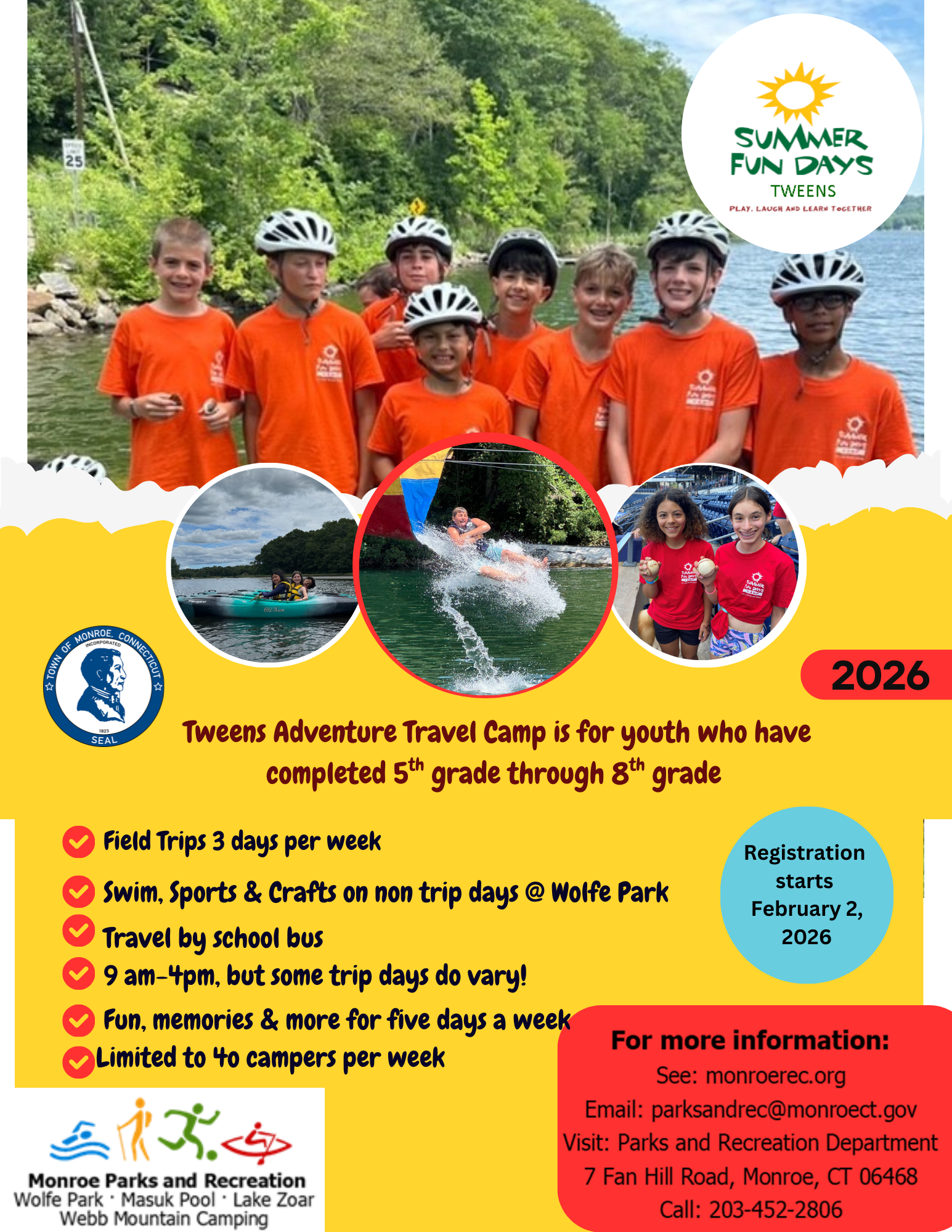 Registration will open up on Monday, February 2, 2026 for the Town of Monroe's only sponsored full day summer program for youth who have completed PreK 4 through 8th grade.