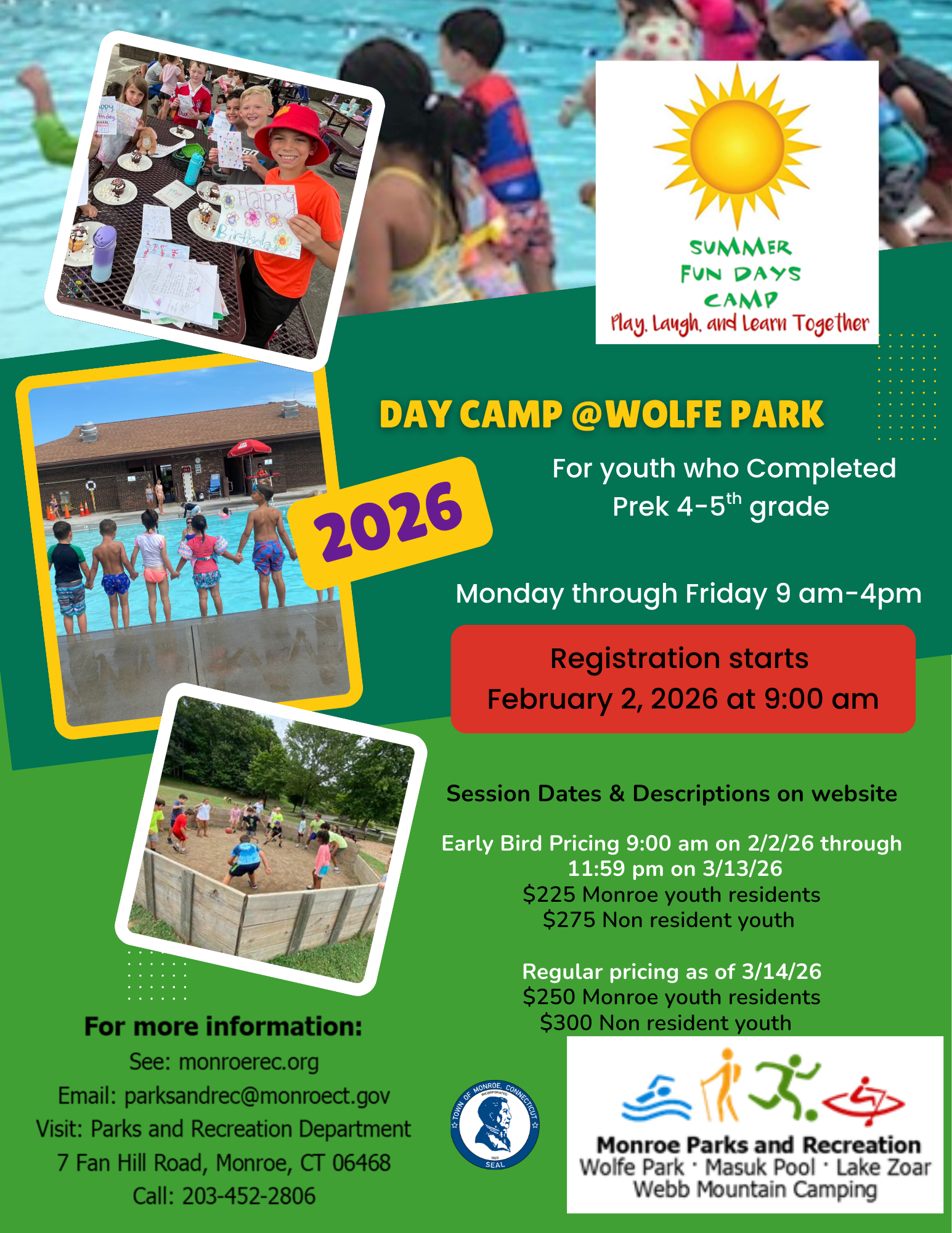 In case of inclement weather, we will be housed at one of the Monroe Public Schools. Trips, special events and the days activities may have to change. Our alert system will be set up for you to join to receive messages in your family account at the time of registration.