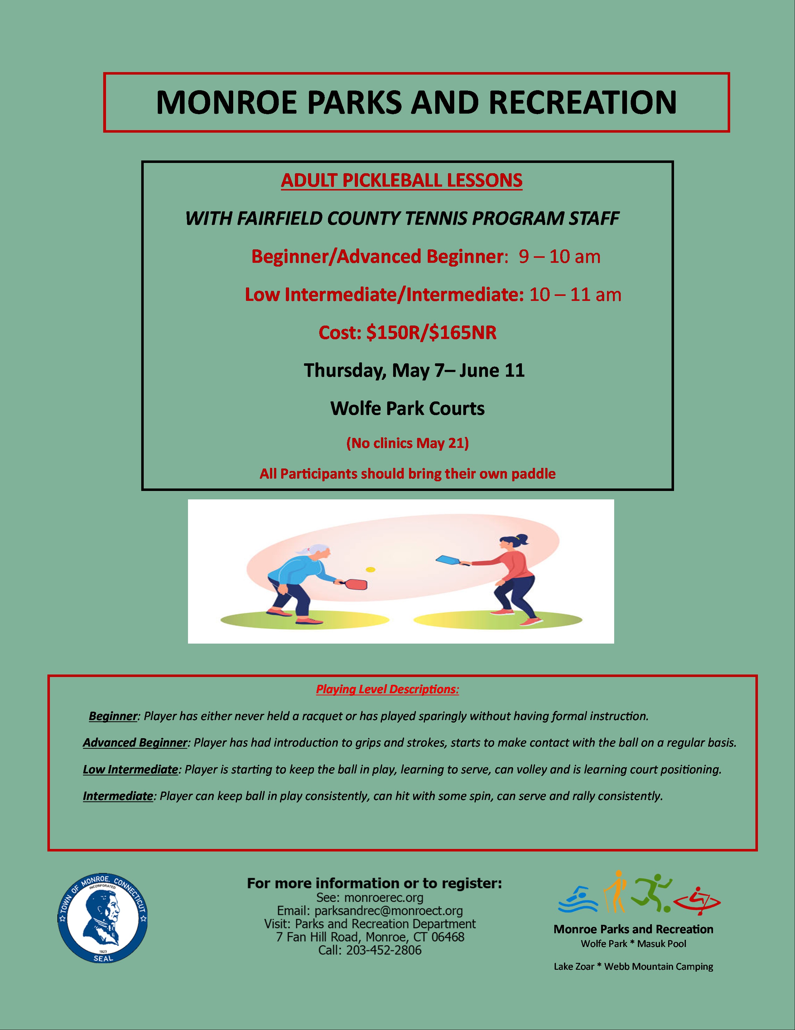 Monroe Parks and Recreation Department has teamed up with Fairfield County Tennis Program who have some expert pickleball instructors on their staff that will give some morning lessons.