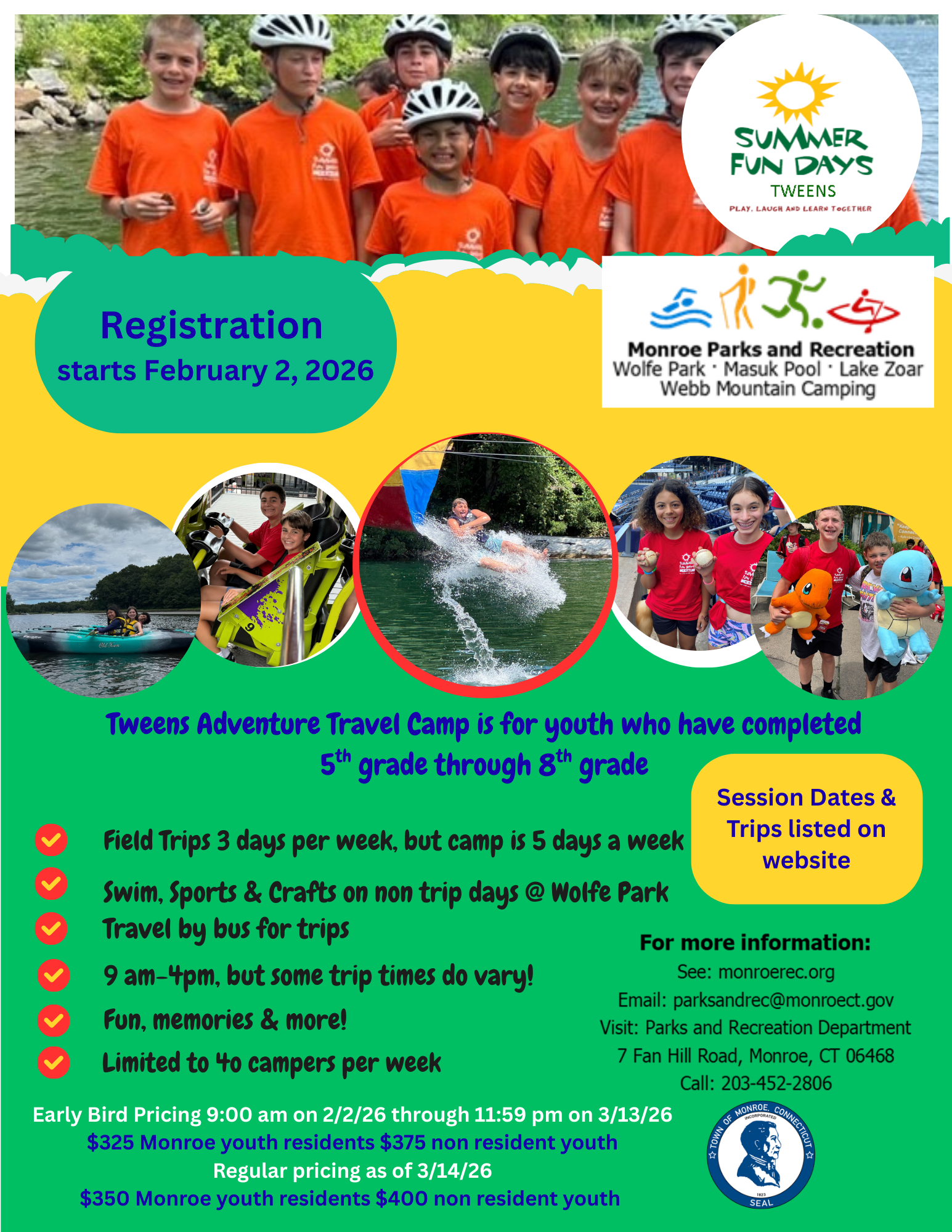 In case of inclement weather, we will be housed at one of the Monroe Public Schools and trips, special events and daily activities may change. Our alert system will be set up for you to join to receive email messages to your family account at the time of registration. It is your responsibility to make sure a valid email address is on file in your account that your check often, plus activate by selecting YES to receive ALL emails blast.