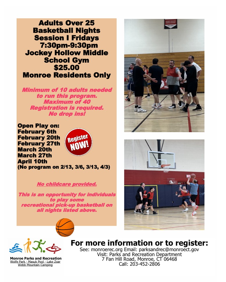 Spectators and children need to be left at home. This program is for Monroe residents only and all are required to register/pay before starting. There is no prorating for this activity.