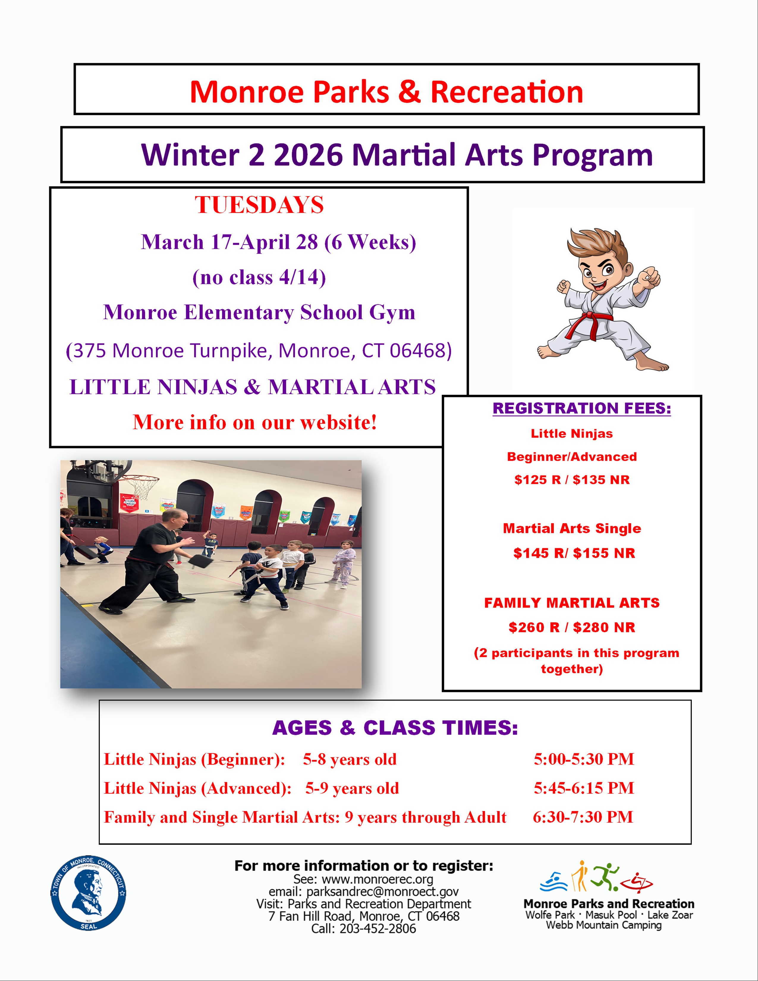 Join us on Tuesdays at the Monroe Elementary School Gym for our Little Ninjas and Family Martial Arts Program. (Child with older sibling or parent/guardian)